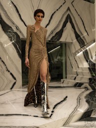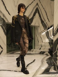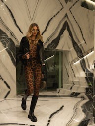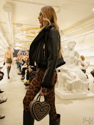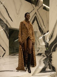 Il tema dell’“istinto animale” attraversa l’intera collezione con una raffinata interpretazione contemporanea. Stampe leopardate, texture in pelle e dettagli iconografici ispirati al mondo animale decorano i capi con equilibrio e carattere. Cappotti oversize leopardati convivono con miniabiti luminosi ispirati alla luce del sole invernale, creando un dialogo perfetto tra gioco e sofisticazione.